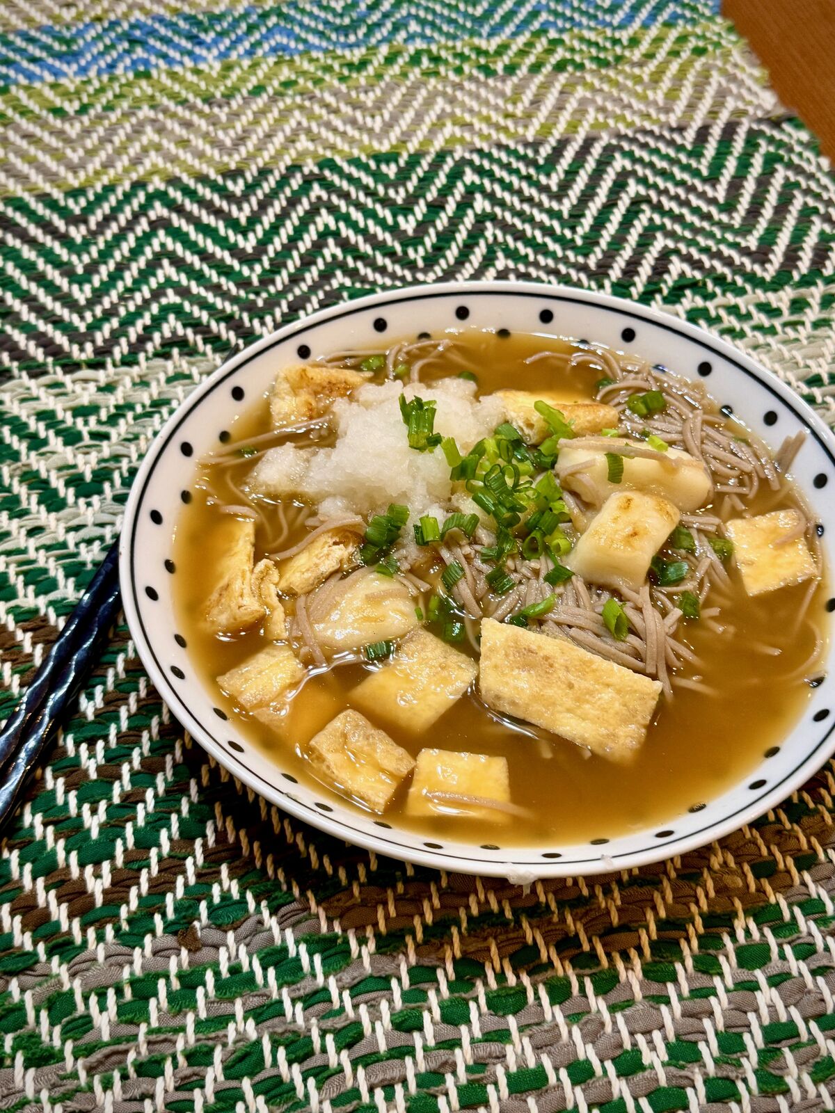◎主な材料・・そば、切り餅、あぶら揚げ、大根、主な調味料は、だし汁です。